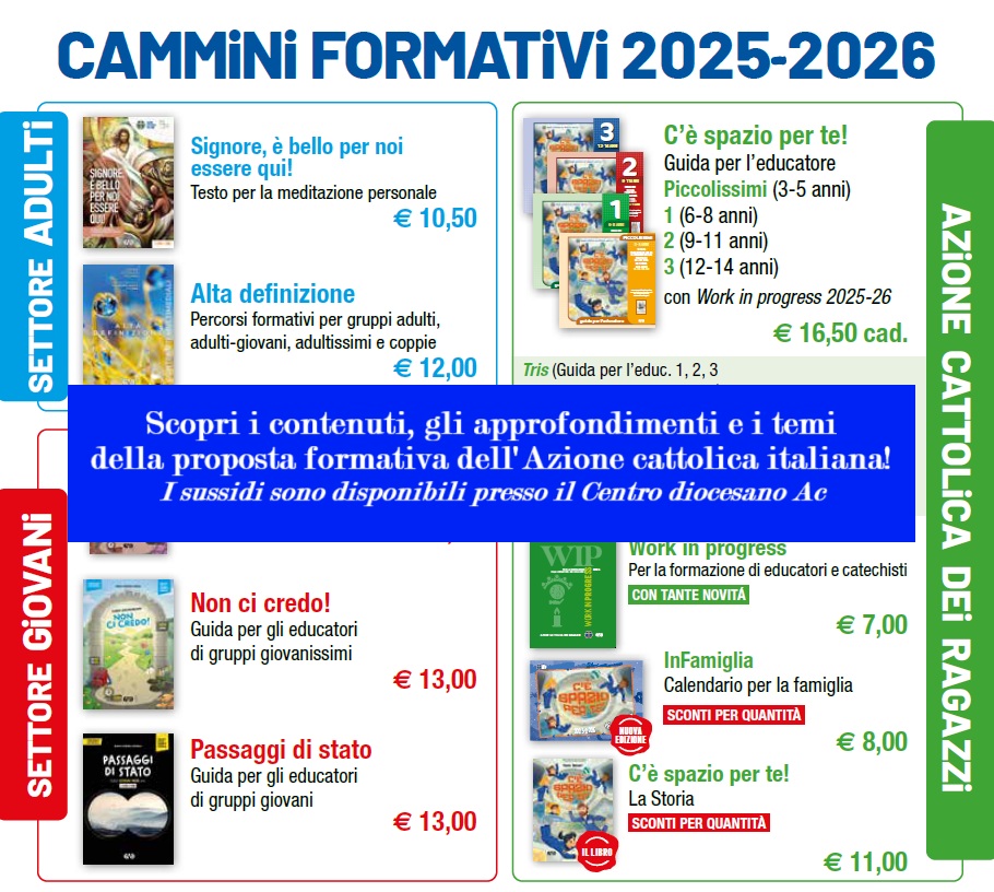 La proposta dell'Azione Cattolica dei Ragazzi 2025/26 è utilizzabile per l'iniziazione cristiana di bambini e ragazzi (autorizzazione ufficiale CEI) dai 6 ai 14 anni; affianca alla guida per catechisti ed educatori materiali per i genitori e le famiglie e i testi per la preghiera personale nel Tempo[...]