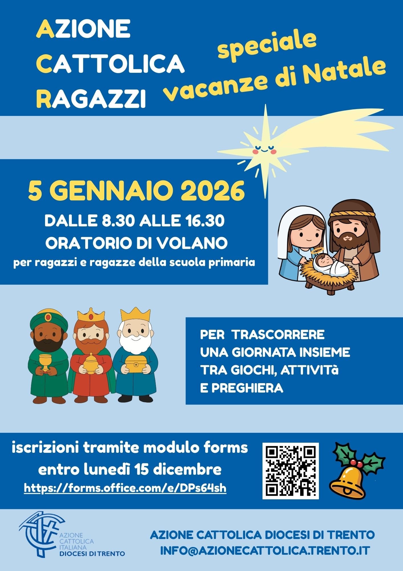 I responsabili e gli educatori dell’Azione Cattolica dei Ragazzi di Rovereto e Volano invitano i bambini delle elementari alla Giornata Speciale Acr di Natale dalle 8.30 alle 16.30 all’oratorio di Volano.