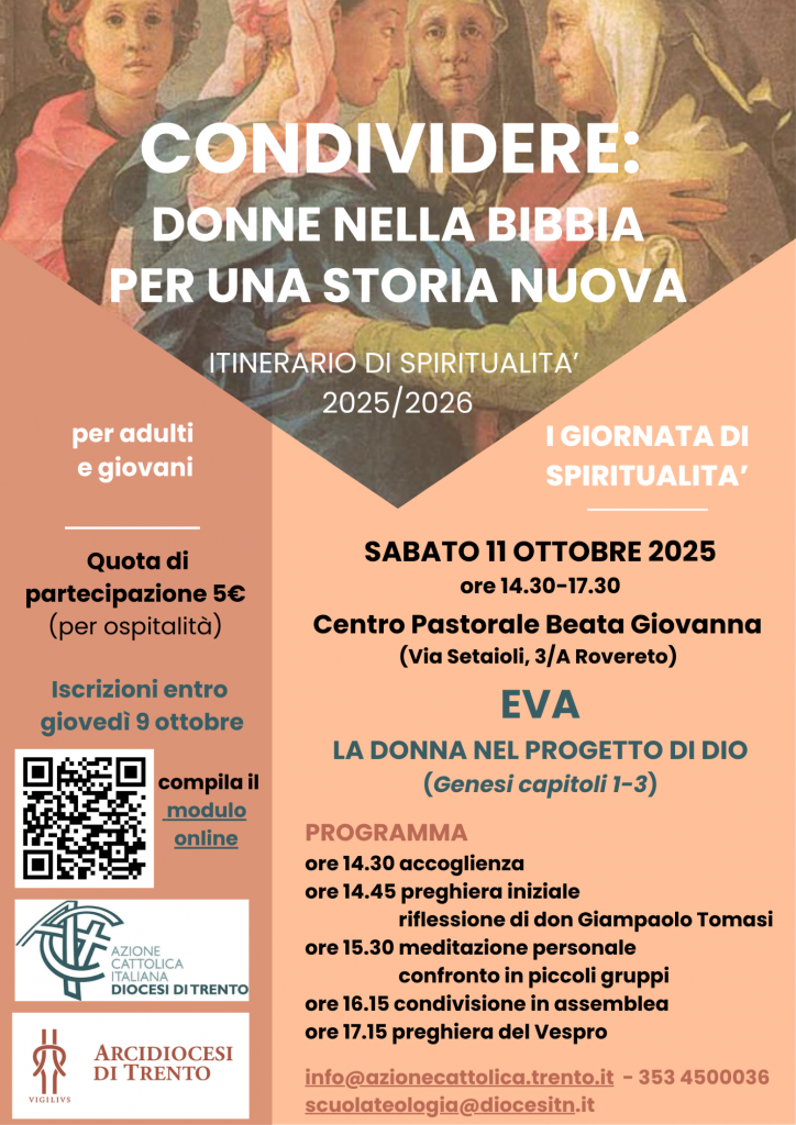 Nel primo appuntamento dell’itinerario di spiritualità 2025-2026 “CONDIVIDERE – donne nella Bibbia per una storia nuova” l’assistente spirituale dell’Azione cattolica diocesana don Giampaolo Tomasi offrirà una meditazione su Eva: la donna nel progetto di Dio a partire dalla Parola di Dio in Genesi capitoli 1-3.