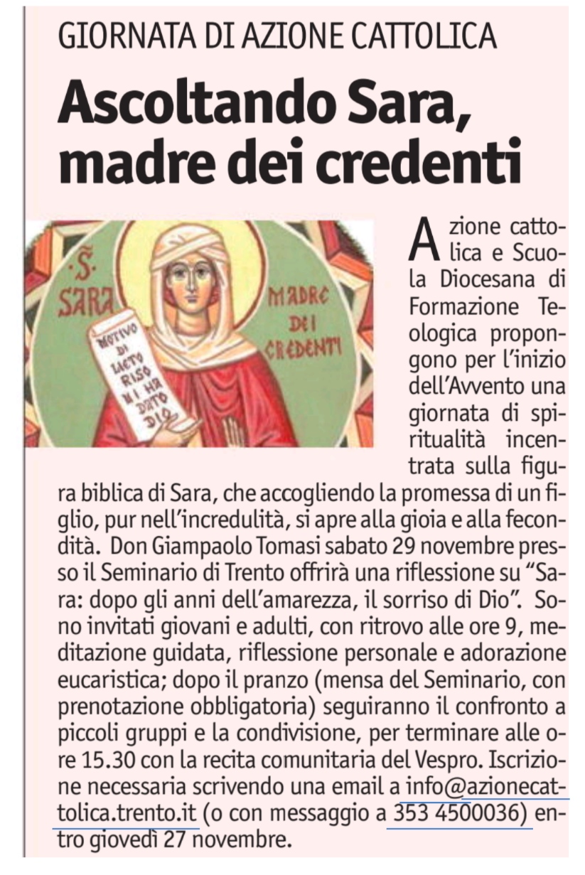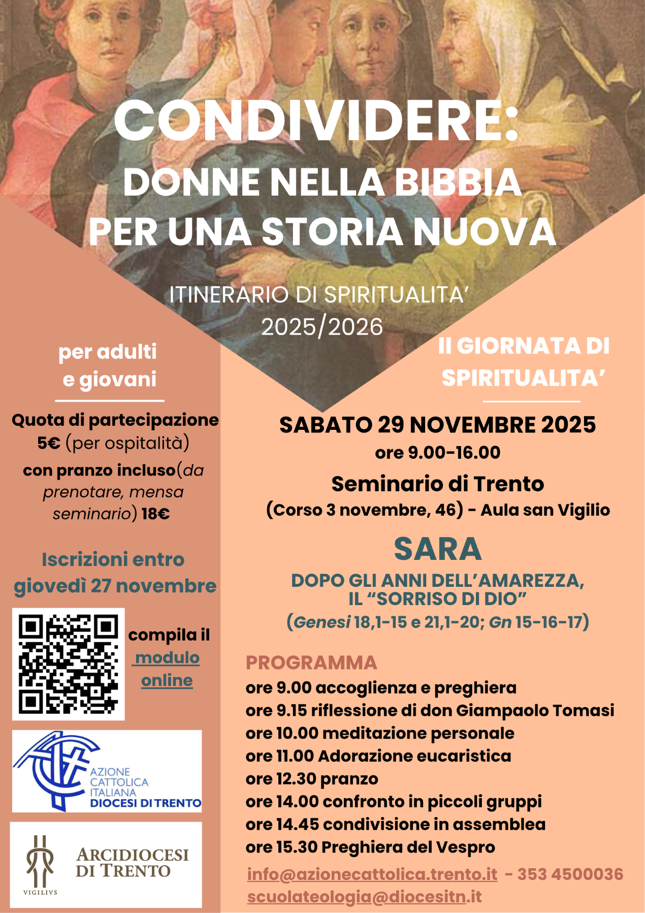 Nel secondo appuntamento dell’itinerario di spiritualità 2025-2026 “CONDIVIDERE – donne nella Bibbia per una storia nuova” l’assistente spirituale dell’Azione cattolica diocesana don Giampaolo Tomasi offrirà una meditazione su Sara: dopo gli anni dell’amarezza, il “sorriso di Dio” a partire dalla Parola di Dio in Genesi 18,1-15 e 21,1-20 (leggere anche i capitoli 15, 16 e 17)