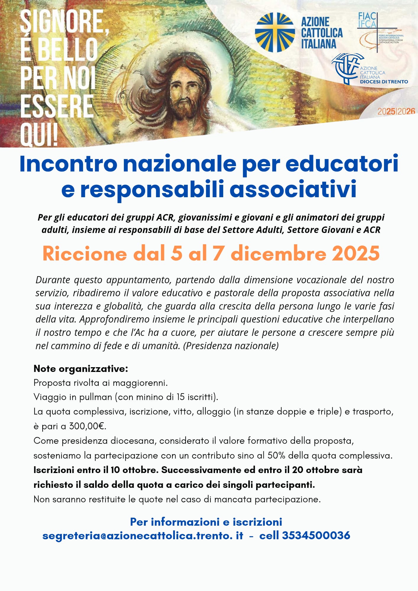 L’Azione cattolica diocesana invita gli educatori Acr maggiorenni e gli animatori di gruppo a partecipare all’incontro nazionale dal 5 al 7 dicembre a Riccione: un convegno unitario in cui “rilanciare una riflessione comune sul modo in cui l’Ac, attraverso il servizio educativo che offre alla Chiesa e al Paese, possa aiutare a far crescere con speranza i semi buoni del nostro tempo, nella comunione ecclesiale e nell’impegno a vivere la sinodalità come dimensione costitutiva, alla luce del nostro Progetto Formativo